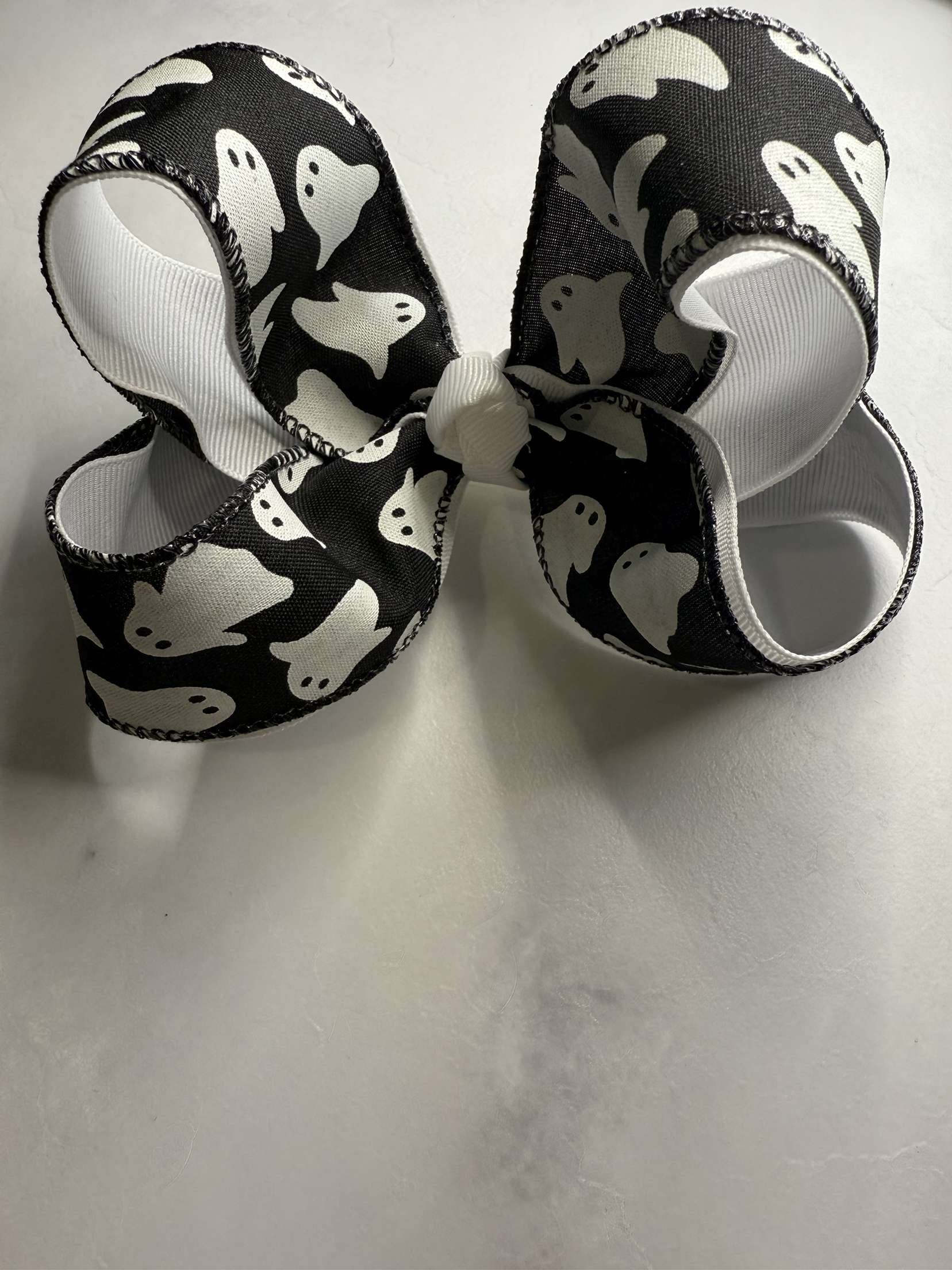Roughly 5 in bow With white backing and glow in the dark ghost ribbon on alligator clip
